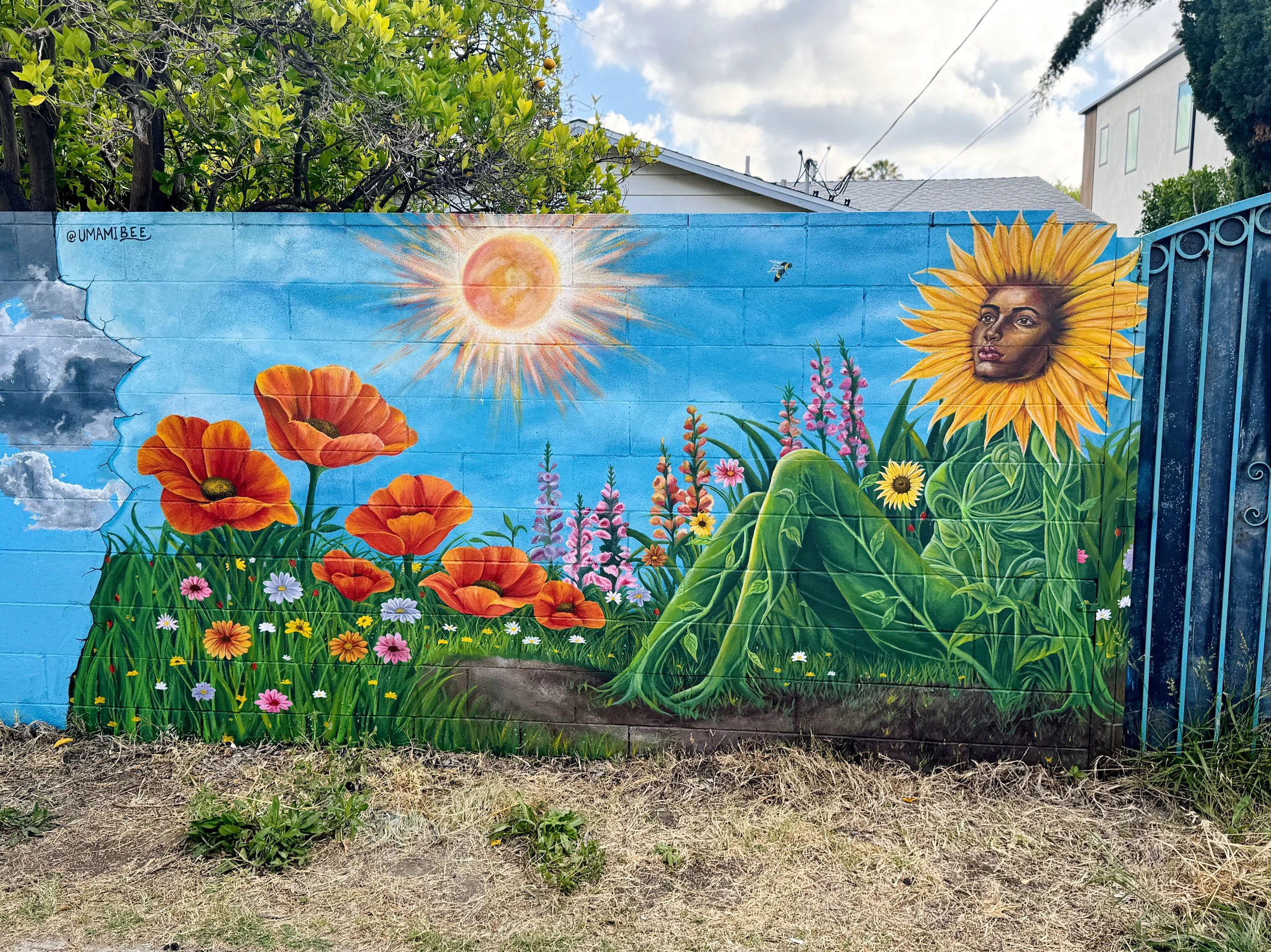 Field of Dreams is a surreal mural by Umami Bee in Venice CA, depicting a sunflower woman emerging from the earth in a dreamlike alternate reality. Rooted in transformation, growth, and imagination, the piece reflects the artist’s passion for creating worlds that could not otherwise exist. A crack in the wall serves as a portal-like detail, suggesting this scene belongs to another dimension rather than existing only in the mind. Surrounding flowers, a bumblebee, and small hidden critters add layers of symbolism tied to nature, life cycles, and interconnectedness. Field of Dreams invites viewers to step into a universe where humanity and the natural world become one.